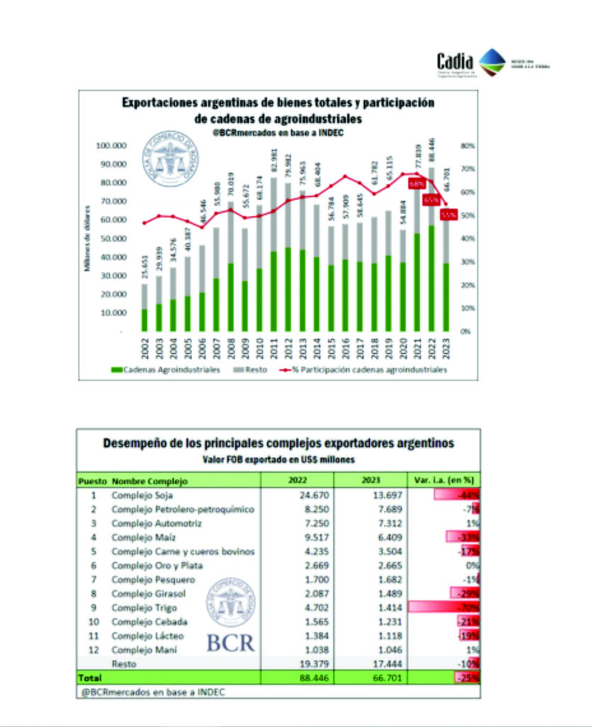 en más de una década. De un cercano 70% de las exportaciones en 2021, la agroindustria generó el 55% de las exportaciones argentinas en 2023, producto de la generalizada sequía.