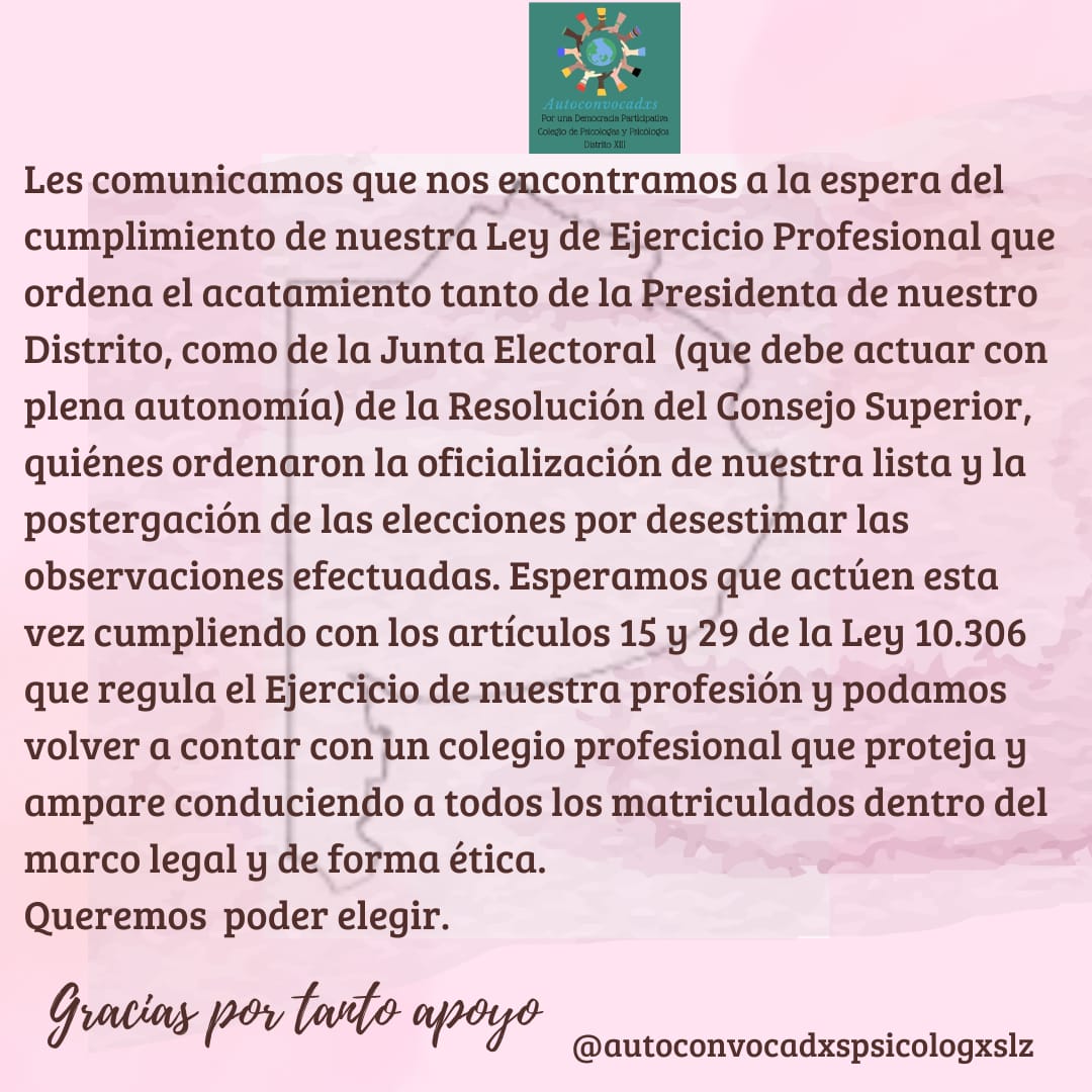 Somos colegas matriculadxs en el Distrito XIII del Colegio de Psicólogxs de Lomas de Zamora, que autoconvocadxs nos fuimos agrupando a fin de configurar una propuesta alternativa a la hegemónica que hace más de 10 años dirige el distrito.