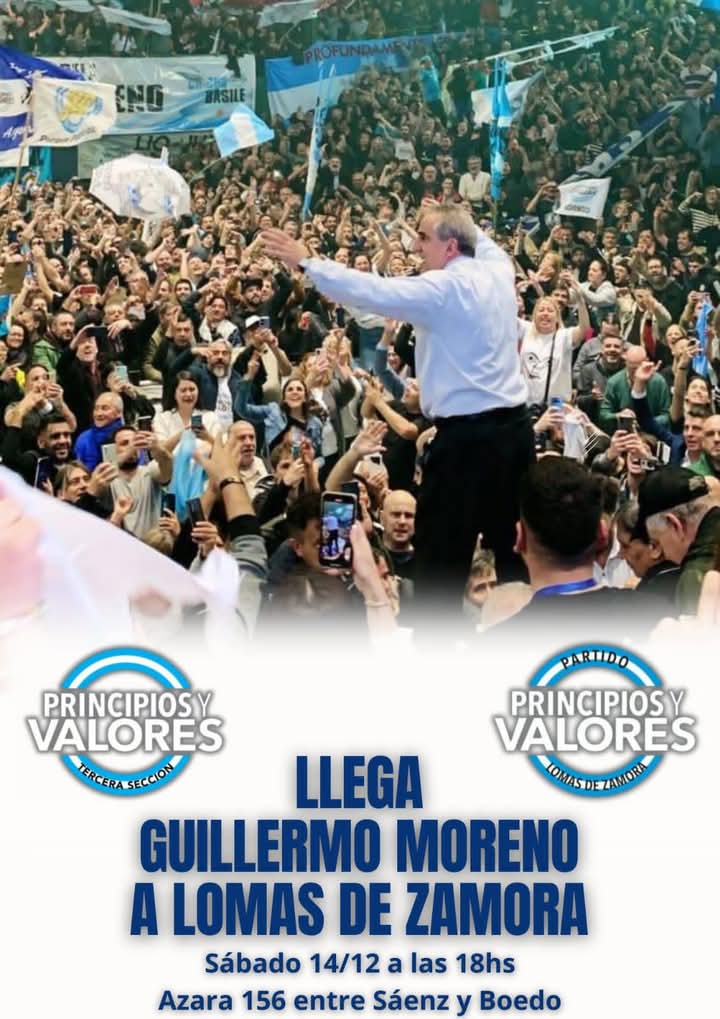 Guillermo Moreno se hará presente a las 18 hs en Azara 156 entre Saenz y Boedo en pleno centro de Lomas de Zamora, la llegada de Moreno es organizada por los militantes del Partido Principios y Valores y comandados por la responsable de la tercera sección electoral Marita Velazquez quien viene realizando una gran labor en el armado de toda la 3 sección electoral, que día a día crece y se agregan mas compañero a los distritos.