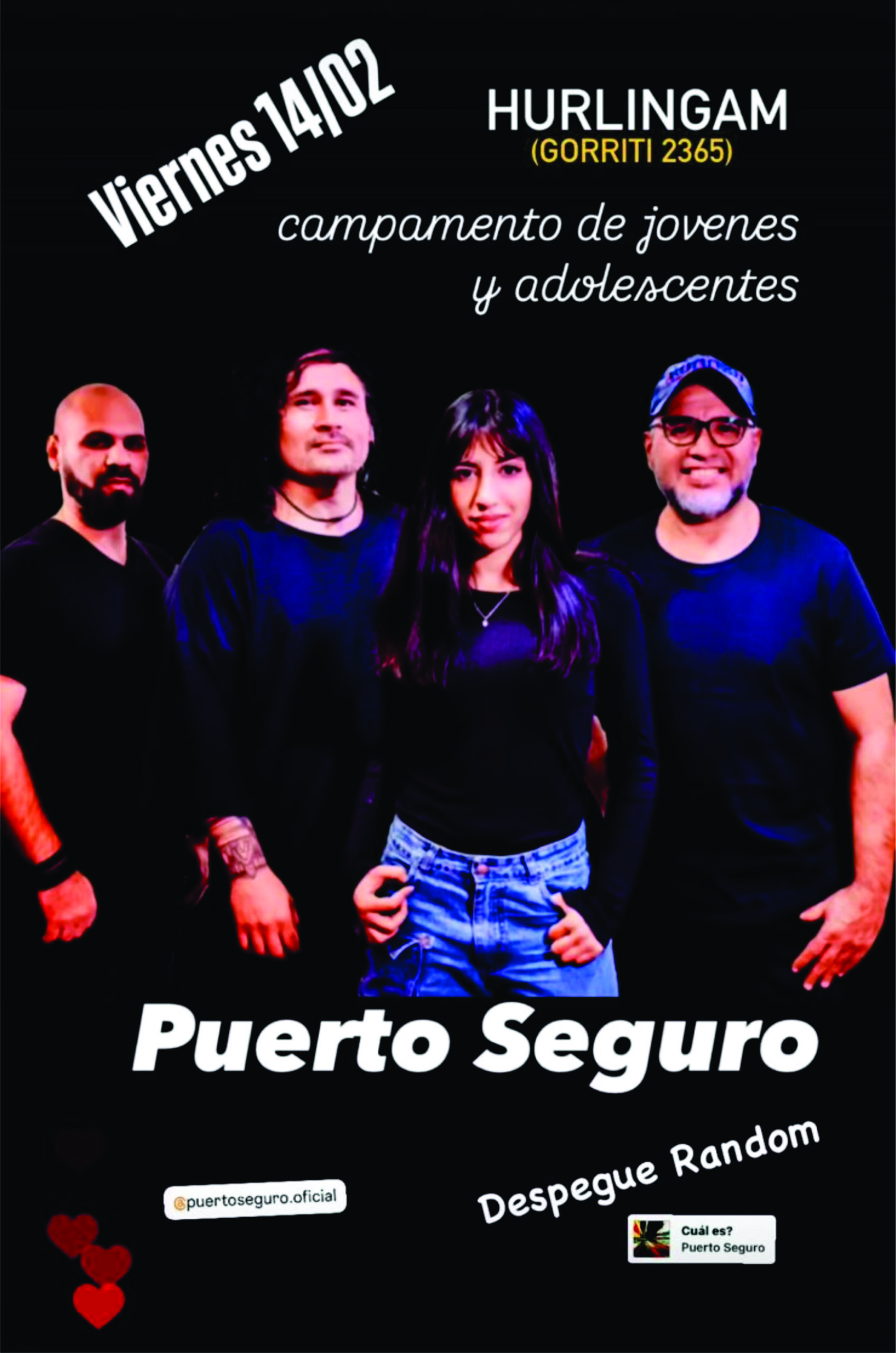 La banda Puerto Seguro se presentará el próximo 14 de febrero en la ciudad de Hurlingham, en el marco del campamento para jóvenes y adolescentes «Despegue Random», un evento exclusivo de la organización Red Joven, liderada por el pastor Diego Pazuelo.
