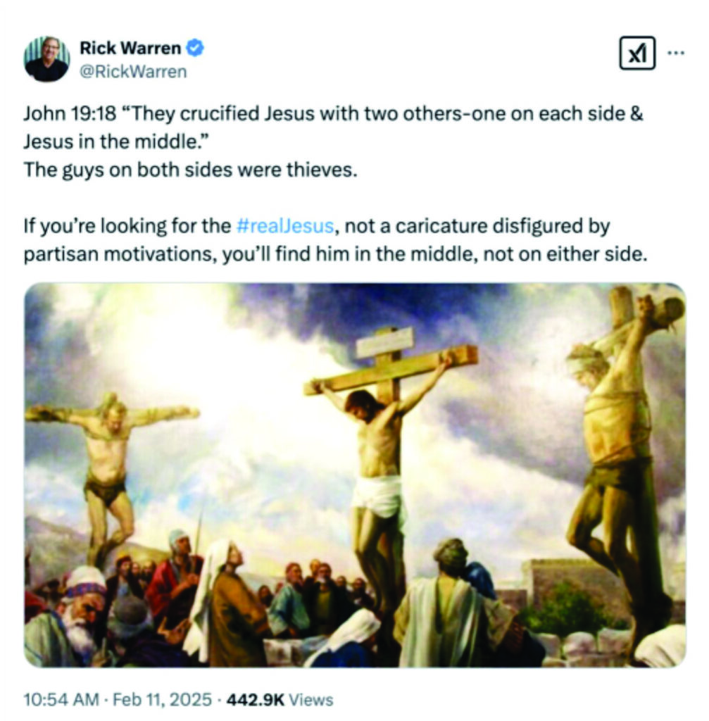 Como te informamos la semana Rick Warren recibió críticas luego de sugerir aparentemente que Jesucristo era un centrista político. En una publicación del 11 de febrero en la red social X, citó Juan 19:18, que describe la crucifixión de Jesús entre dos ladrones con las palabras «Si estás buscando al verdadero Jesús, no una caricatura desfigurada por motivaciones partidistas, lo encontrarás en el medio, no a un lado ni al otro»