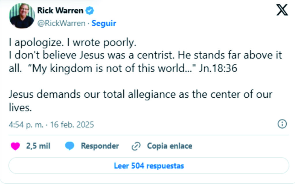 Tras las críticas Warren borró su polémica y días meditando cómo salir del lío, el pasado lunes en el que expresó «Me disculpo. Escribí mal.No creo que Jesús fuera centrista. Él está muy por encima de todo. “Mi reino no es de este mundo…” Jn.18:36.Jesús exige nuestra total lealtad como centro de nuestras vidas.